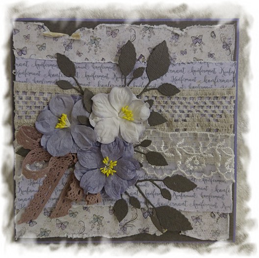 Det ble ett konfirmasjonskort med lag på lag med herlige papirer og blonder. Papirene har jeg herjet litt med og fått en litt "rufsete" look
